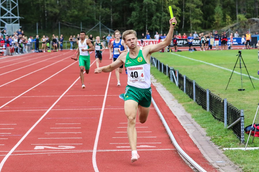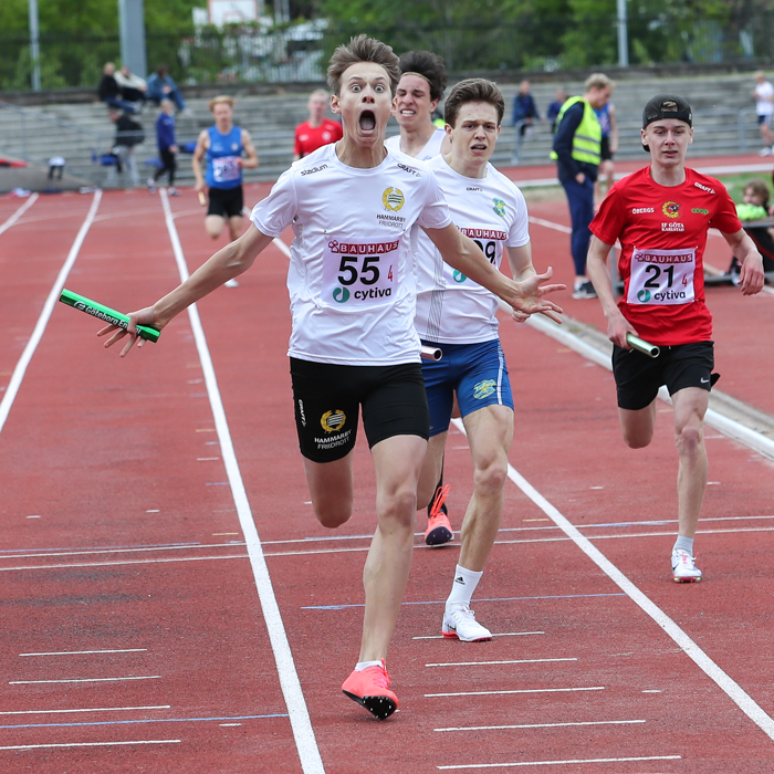 Vi hade även ännu ett lag med på 4x100m med Noah Bucht Wesslén, Filip Engström, Teo Borgius och Niklas Wall. Vi blev även här lite nervösa då sista växeln var väldigt lång men grabbarna lyckades ordna upp det i finalen och kom fyra på 43,43. Stabile Noah öppnade bra, Filip gjorde det bra på bortre lång. Teo gjorde en superb kurva och Niklas fullföljde sin upploppsraka på ett snyggt sätt.
